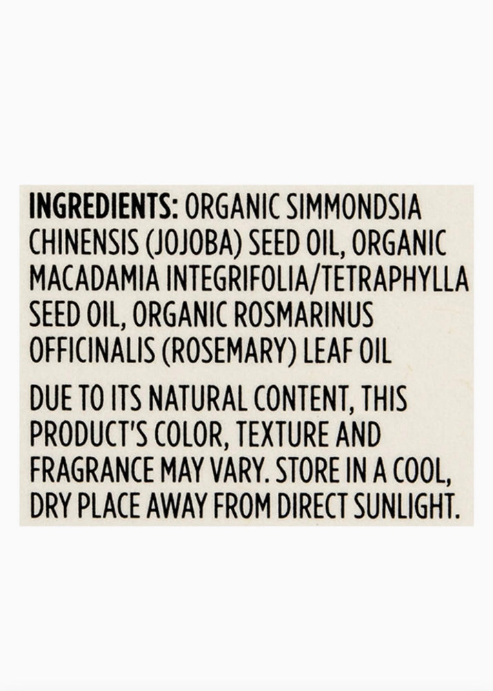 Answer 1: The serum contains three organic ingredients: Rosemary Oil, which soothes and invigorates the scalp; Macadamia Oil, which moisturizes and supports compromised hair; and Jojoba Oil, a lightweight moisturizer that helps nourish hair without greasiness. Together, these ingredients promote healthier-looking hair and support hair growth from the roots.